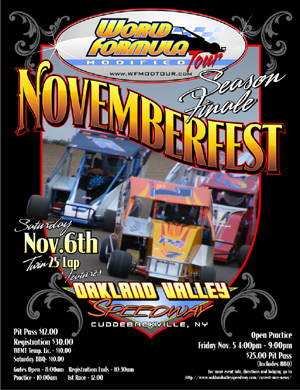 World Formula Modified Tour point leader Paul Pairo captured his second win in a row and third of the season this past Saturday at Oaklnd Valley Speedway and extended his point lead on Kenny Lund in the rescheduled event from the Wall Stadium closure. After winning the heat and pulling the no invert chip, Pairo and 2010 Wall WF/CS champ, Dave Parker lead the field to the green on the chilly night NY night. Third place starter, Ted Harris jumped into second at the drop of the green and put constant pressure on Pairo for the entire 20 lap non stop run looking for his first WFMT victory, but Pairo was able to hold off the challenges when the checkers waved by .5 seconds to take the win. Dave Parker crossed the line third, followed by Lund and Nick Cottone. Don Boonstra, Noel Scheffen and AMSRA vet and WFMT newcomer, Fred Kendall rounded out the finishing order. Pairo's win stretched his point lead to 52 markers with the current drops over Lund going into the final round at Novemberfest. On the strength of his fifth top three of the season, Ted Harris locked up the WFMT Rookie of the Year honors.