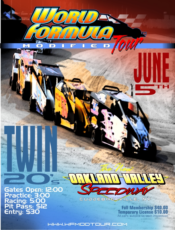 The World Formula Modified Tour will have a busy weekend after the July 4th break with two features on tap at the Oakland Valley Speedway. In addition to the regularly scheduled 20 lap event, the second feature of original Twin 20's from June 5th that was posponed, will be made up. The starting line up for the make-up feature, which was set from the first feature finish is as follows.